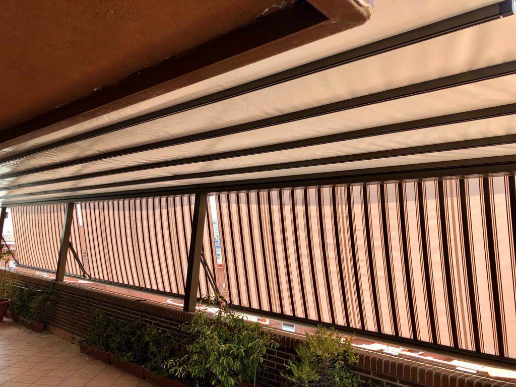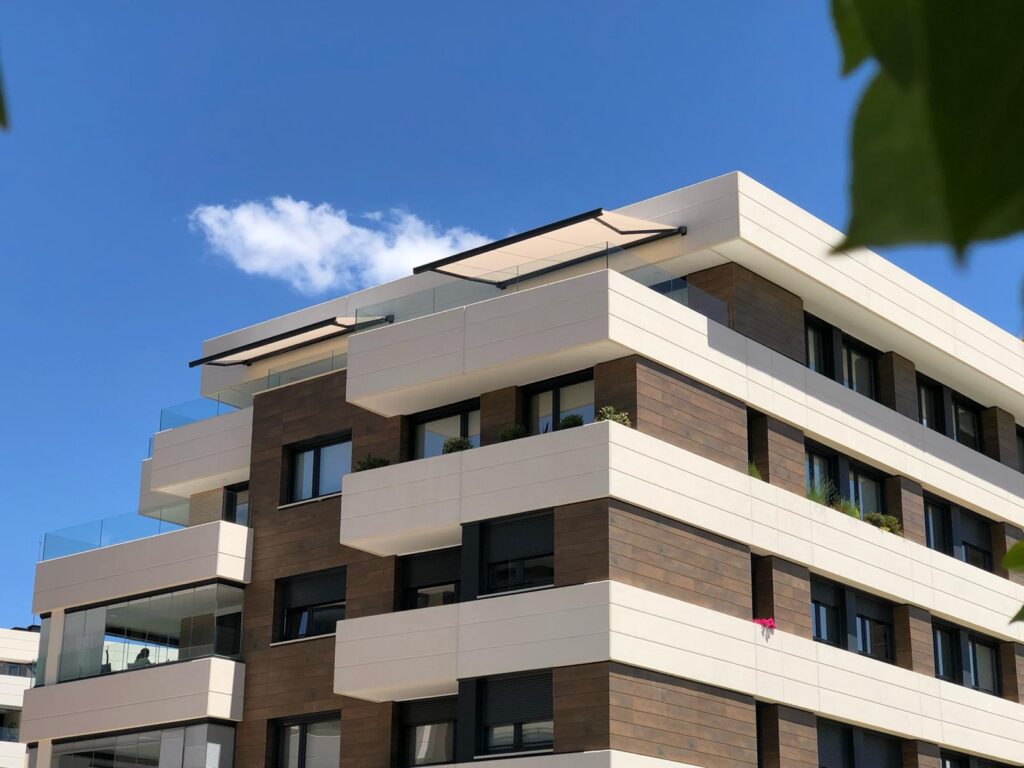 Cofre or cassette awnings feature a protective enclosure that houses the fabric, arms, and all mechanical parts when retracted, ensuring the system stays clean and weather-resistant. This protection significantly extends the lifespan of the awning by shielding it from rain, dust, and debris. The sleek, compact design adds a modern touch to any building, making it look neat and uncluttered when the awning is not in use.
